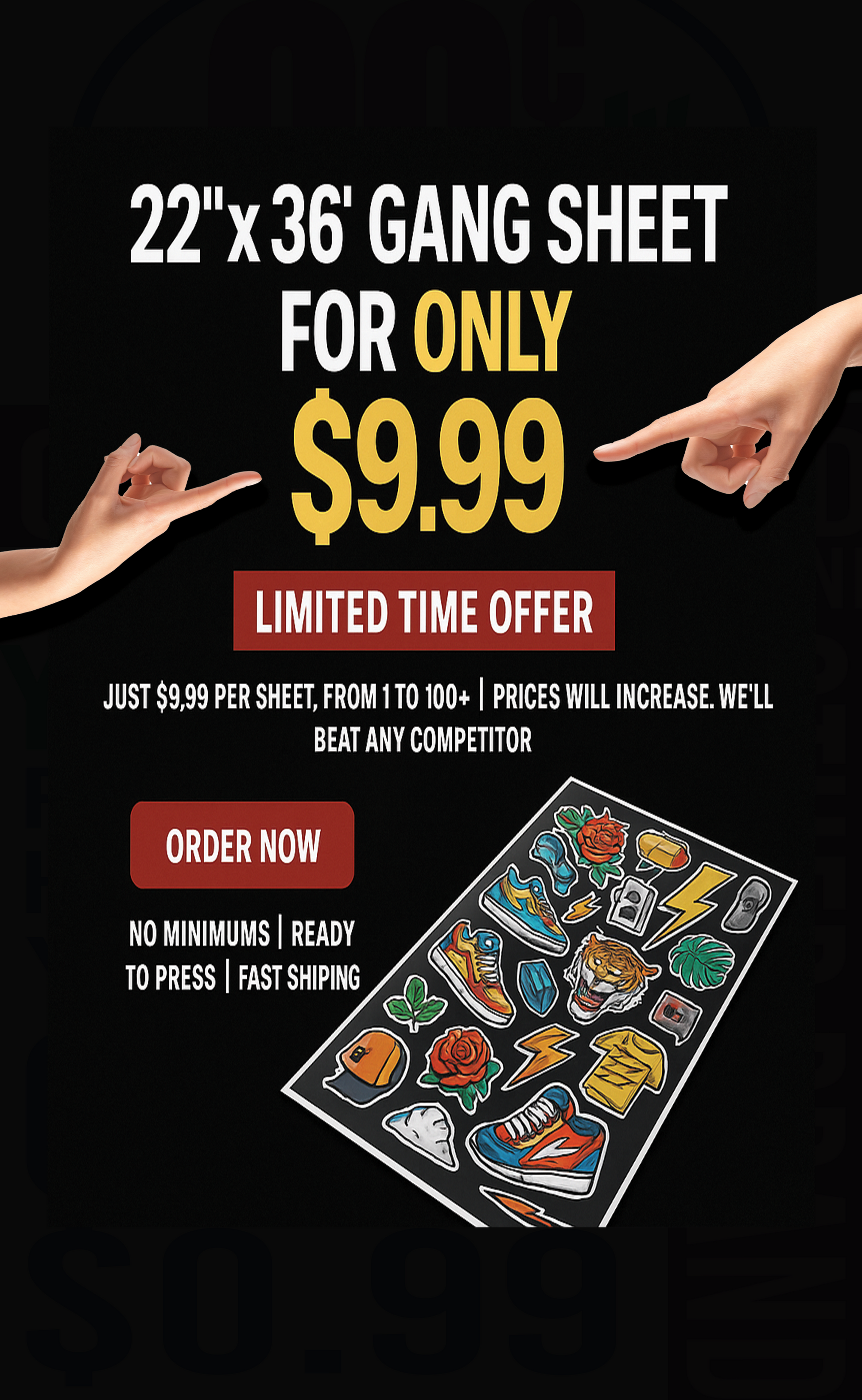 Print more for less with our 22x36 premium DTF gang sheets, designed for bulk logos, graphics, and custom designs. Made with high-grade Japanese film and vibrant Japanese inks for sharp detail, bold color, and long-lasting durability. Cold-peel, press-ready, and produced in Los Angeles by experienced professionals. Perfect for apparel brands and serious creators.